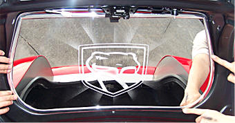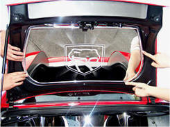 With all modifications completed you may now begin to install the new panel insert. You will notice a “V” shaped inner framework of the deck lid. Scrub this framework with household rubbing alcohol to remove any dirt or surface contaminants. Then swipe the area with the adhesive promoter provided. Once this has been completed place the panel in position and make note of its position and just how you are going to maneuver it in place. Place a large golf ball size blob of silicone to each of the areas between the attachment tape on the panel insert. Once this is done peel the red release liner and carefully place the panel into position and press firmly to set to the prepared framework. Allow the lid to remain vertical for several hours to set.